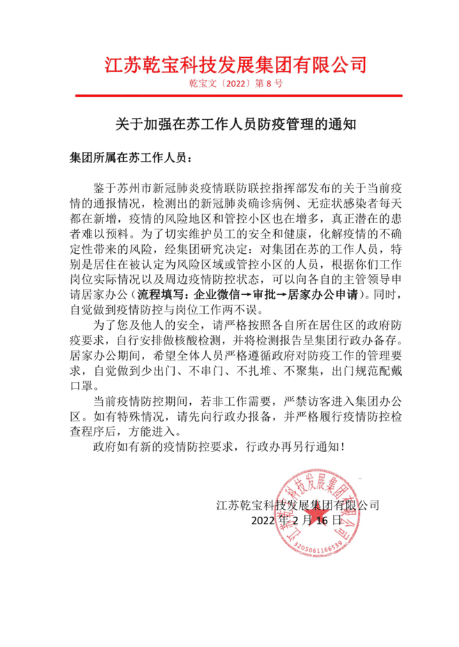 疫情就是命令,防控就是責任。蘇州市“2·13”新冠肺炎疫情的突發,牽動著無數人的心。江蘇乾寶科技發展集團(以下簡稱乾寶集團)上下高度重視,迅速行動起來,嚴格落實蘇州市委市政府和蘇州市新冠疫情防控指揮部,以及屬地的各項疫情防控要求,積極采取有效措施同心戰疫,確保員工群眾生命健康安全。2月13日,乾寶集團緊鑼密鼓準備的全集團2021年度工作總結會暨2022年新年工作會議準備就緒,分布江蘇各地的集團各版...